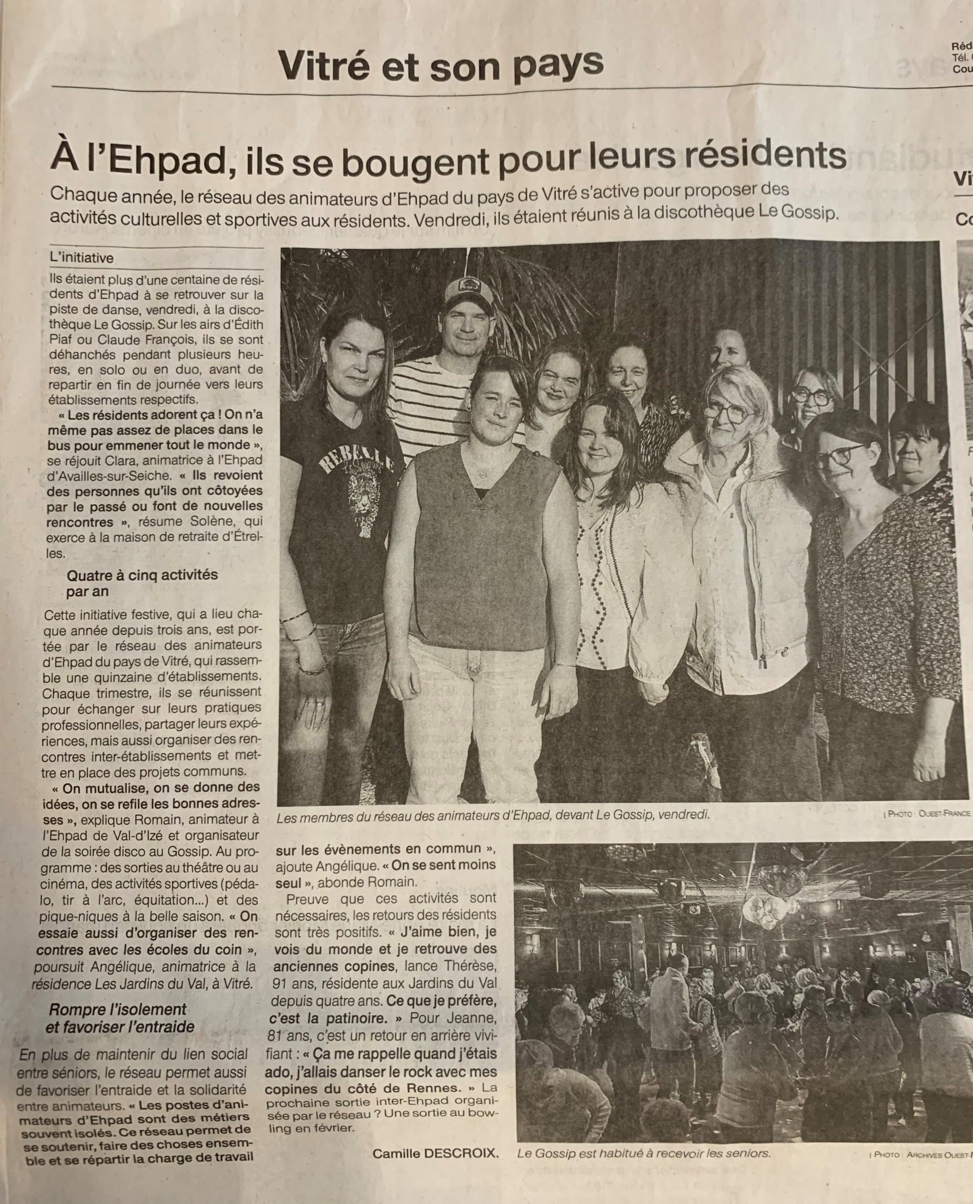Comme chaque année, le réseau d’animateurs du pays de Vitré propose 4 ou 5 animations festives et culturelles. Comme vendredi 14 Novembre, au Gossip à Vitré (Discothèque). Ils étaient une centaine de résidents, venus de plusieurs établissements, pour profiter de ce moment convivial. Pour l’occasion et comme ces 3 dernières années, la discothèque a ouvert […]